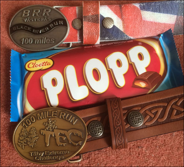 Black River Run 100, buckle #22 earnt! Very pleased with 23:39 in the end as you only get buckles here for sub 24 and I've seen the medals! (Make the 77p Running Imp ones look impressive!) One of my better runs as really my first sub 24 on a proper trail marathon, my previous vaguely reasonable times have all been on flat tracks and whilst this only had maybe 5000 or 6000' feet of climb there were some horrible rocky sections that had more trip hazards than an Argentinean defensive line. As it was 10 miles loops didn't bother carrying anything aside from my bottle, ipod and electrolytes and started off bang on plan, knocked out marathon distance in 4:30, 50 miles in 9:45 and 60 miles in about 12 hours and I am thinking a really good time was on... but as is often the way, these things come and bite you. By 70 miles I all sorts of worries, sick, nauseous, was foggy and basically couldn't see a thing... which was bad enough but as I have the night vision of a mole it was problematic through the rocky bits. Ah, but that was luxury as one of us made a rookie mistake about mile 81 the red light comes on the head torch. Swedish forests at 4am are DARK, so had to put the headlight on dim... and made progress like a complete snail, to the point I thought a sub 24 had gone as I was going slower than slow treacle, just could not see a thing. But choose your cliche, blah, blah, got on with it when the light began to come up, abandoned the headtorch just couldn't see a thing anyway, managed to stay upright and got it done. Am retiring from 100 milers again! lol